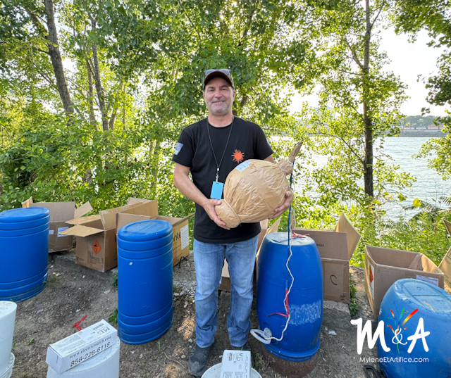 Revenons au dernier spectacle en compétition de cette 39e édition : celui de la France, qui sera présenté ce soir, à 22 heures. C’est une firme qui visite les rampes de lancement montréalaises pour une première fois qui s’affaire à préparer son spectacle depuis dimanche : la firme LUX Factory. Fondée en 2017, la firme est toute jeune, mais son fondateur Arnaud Fouriau œuvre dans le domaine de la pyrotechnie depuis plus de 25 ans. Stimulé très jeune par un gros festival de spectacles de rue près de chez lui à Maubeuge, il y a connu plusieurs grandes sociétés françaises. «J’ai découvert Groupe F à leurs tout débuts., J’ai alors compris qu’on pouvait faire du spectacle avec la pyrotechnie, pas simplement des feux d’artifice. À l’époque, je n’envisageais pas ça comme un métier, j’avais un autre métier – j’ai travaillé dans l’aéronautique pendant 17 ans – et donc je faisais plus ou moins les deux en parallèle. J’ai pu graviter au sein de société reconnues en France en région parisienne, mais j’avais un manque. Donc j’ai relancé une compagnie de spectacles de rue qui était un peu en sommeil et beaucoup à base de feux d’artifice, et ça a pris très fort et question de structure en France, j’ai été obligé de créer ma société il y a maintenant 8 ans ».