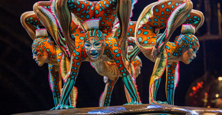Après l’entracte, place à l’«acro net», une discipline développée pour le spectacle Kurios. Essentiellement, les acrobates évoluent sur un filet tendu au maximum et ils sont projetés dans les airs sous l’impulsion des autres artistes. On peut sans doute y voir une sorte d’éloge de l’effort collectif qui permet à l’acrobate d’être projeté à une hauteur qu’il ne pourrait pas atteindre sans la participation de ses collègues. À la fois poétique et spectaculaire!