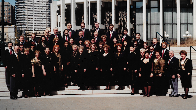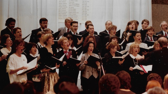 Bob: Avec 55 chanteurs, c’était une chorale qui ne bougeait pas du tout, avec leurs cartables. Toujours de la musique de Broadway, avec un pianiste. En même temps, le Lyric faisait aussi des « book show » (des comédies musicales complètes). On a fait «Company», «The King and I», «The Music Man», «Evita», «Hello Dolly» et d’autres. Les chanteurs provenaient souvent des « book show », parce que ce n’était pas le même groupe. On a aussi gagné des concours de chorales.