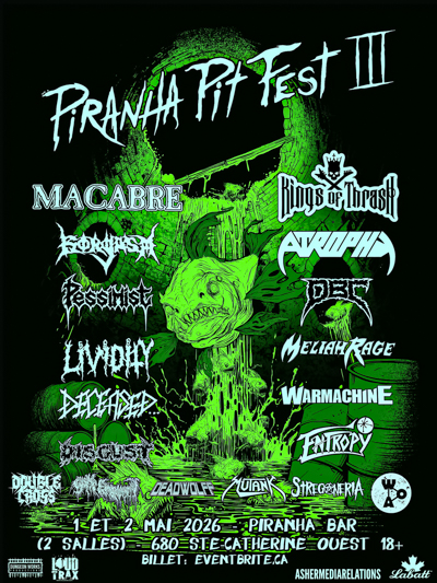 Montréal s’apprête à trembler. Présenté par le Piranha Bar et Dungeonworks Productions, le Piranha Pit Fest revient pour une troisième édition qui s’annonce déjà comme l’événement extrême de l’année. Les 1er et 2 mai 2026, le 680 Sainte-Catherine Ouest deviendra l’épicentre du chaos avec une affiche réunissant légendes internationales et fleurons de la scène locale.