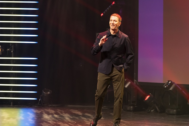 Difficile de ne pas constater à quel point le jeune sexagénaire est en pleine forme. Grand, svelte, énergique, il occupe la scène avec l’assurance d’une rock star, presque d’un athlète, et confirme à quel point l’art de raconter fait partie de son ADN.