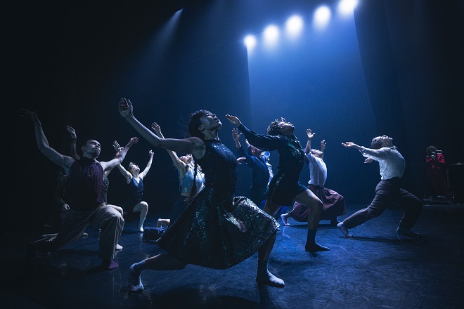 L’effet est hypnotique, amplifié par la musique live – une partition percussive, sombre et cinématographique composée par Shechter lui-même et interprétée par trois musiciens sur scène.